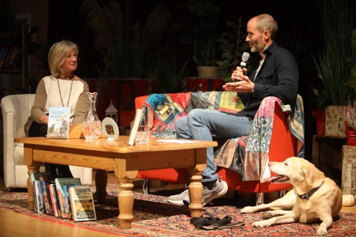 Andrew Cotter with Mabel in conversation with Sally McNair at the 2025 BOOKMARK festival in Blairgowrie.